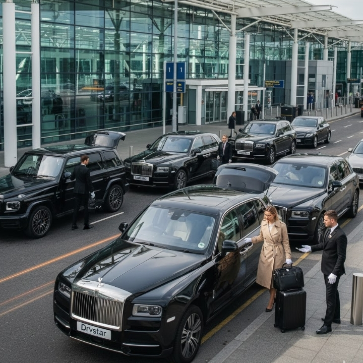 Drvstar provides luxury vehicles, professional chauffeurs, meet & greet service, luggage assistance, 60 minutes free waiting, and real-time flight monitoring for early or delayed flights.